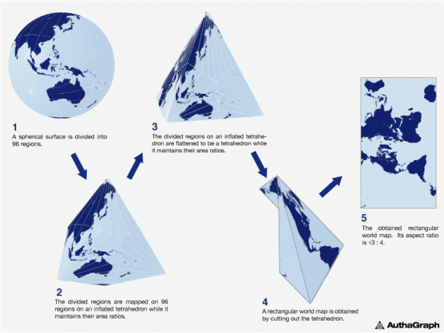 What makes this map so special? The AuthaGraph map divides the globe into 96 regions and transfers them to a tetrahedron shape. This world map can be tiled in any direction without visible seams, and with the Authagraph map, you can choose various regions at its center, which eventually creates a much more proportionally accurate world map.